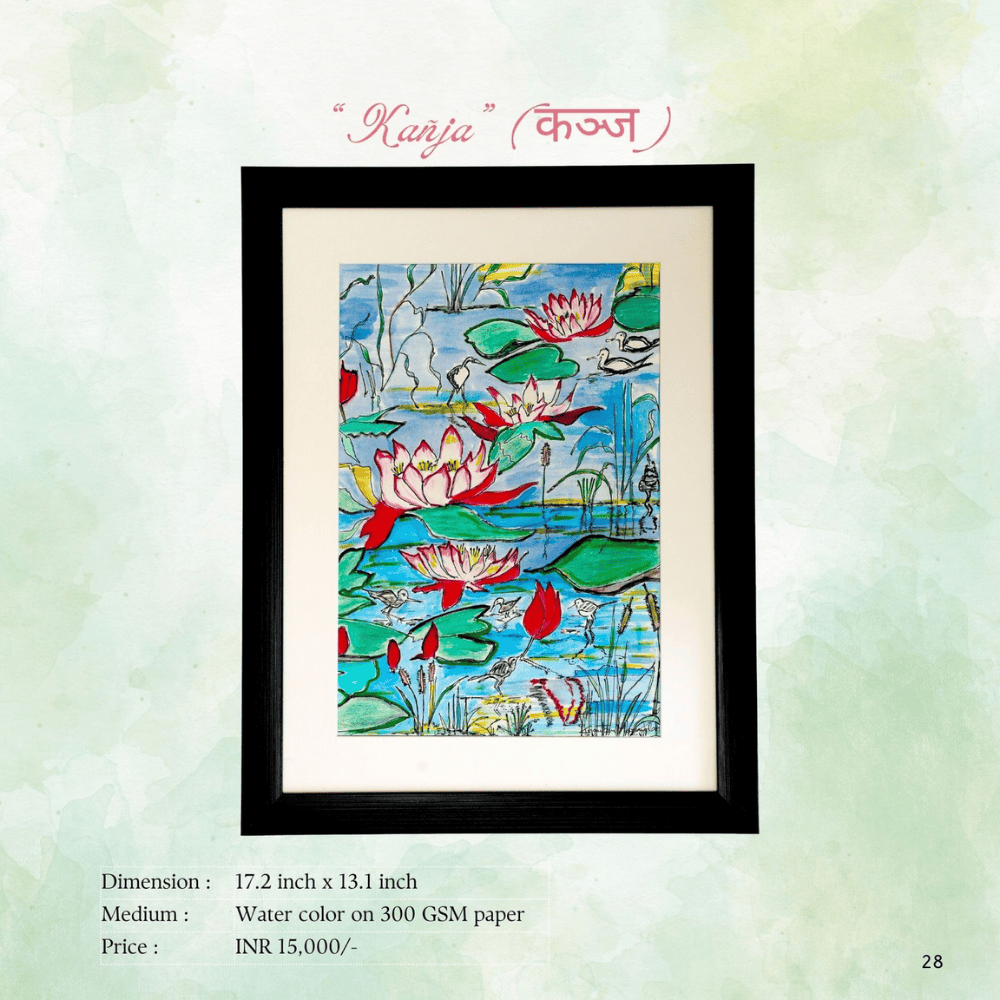The painting not only depicts the ecosystem of the pond but also conveys a deeper symbolic meaning. In Sanskrit, “Kañja” refers to mud or mire, representing the challenges of life. Just as the lotus rises unstained from the murky depths, the painting reflects the human journey of spiritual growth, resilience, and purity amidst life’s adversities.