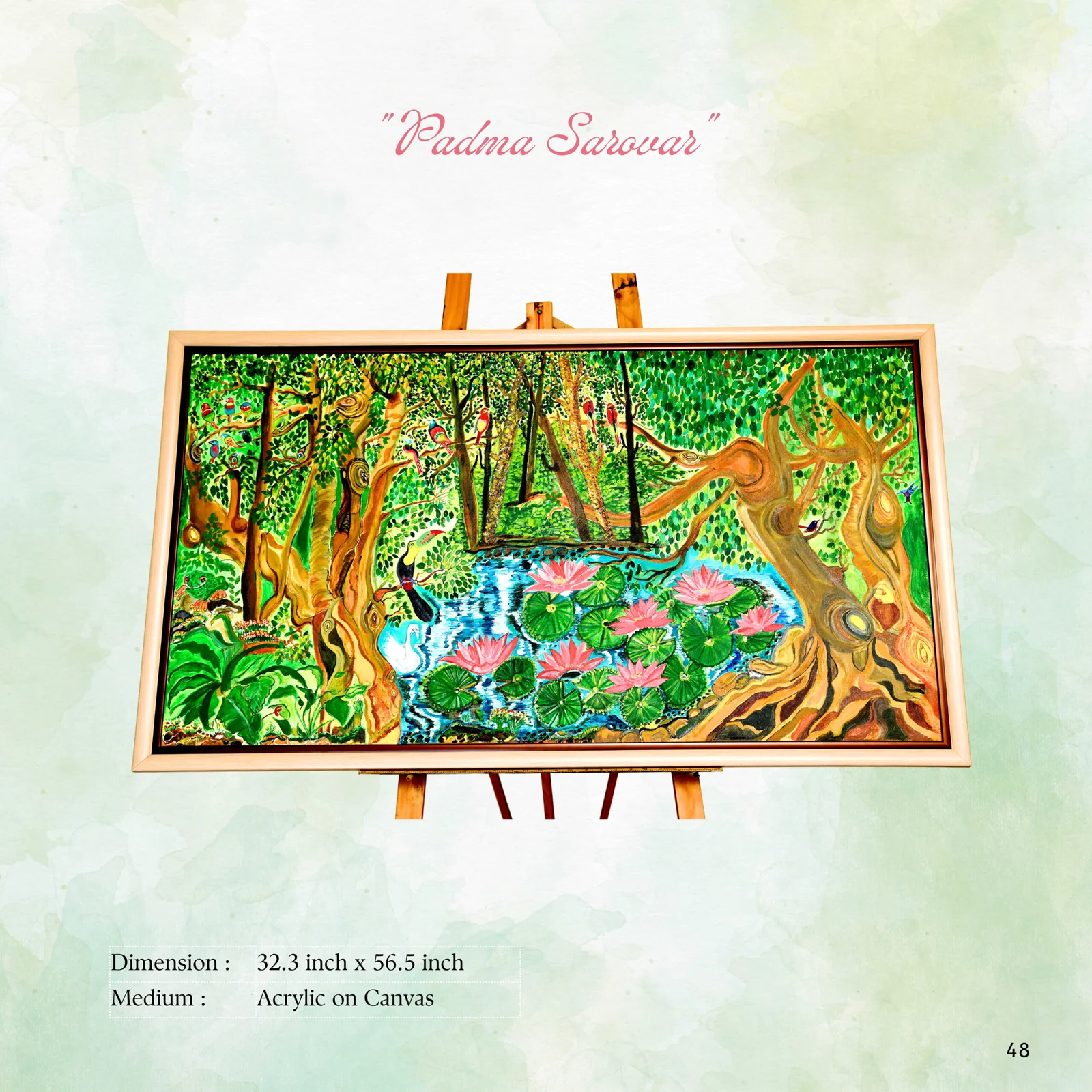 “Padma Sarovar” is an original acrylic painting on canvas by Gautam Mazumdar, created in 2024. Measuring 32.3 × 56.5 in (82 × 144 cm), this hand-painted masterpiece draws inspiration from the sacred dream of Queen Trishala, mother of Lord Mahavira.