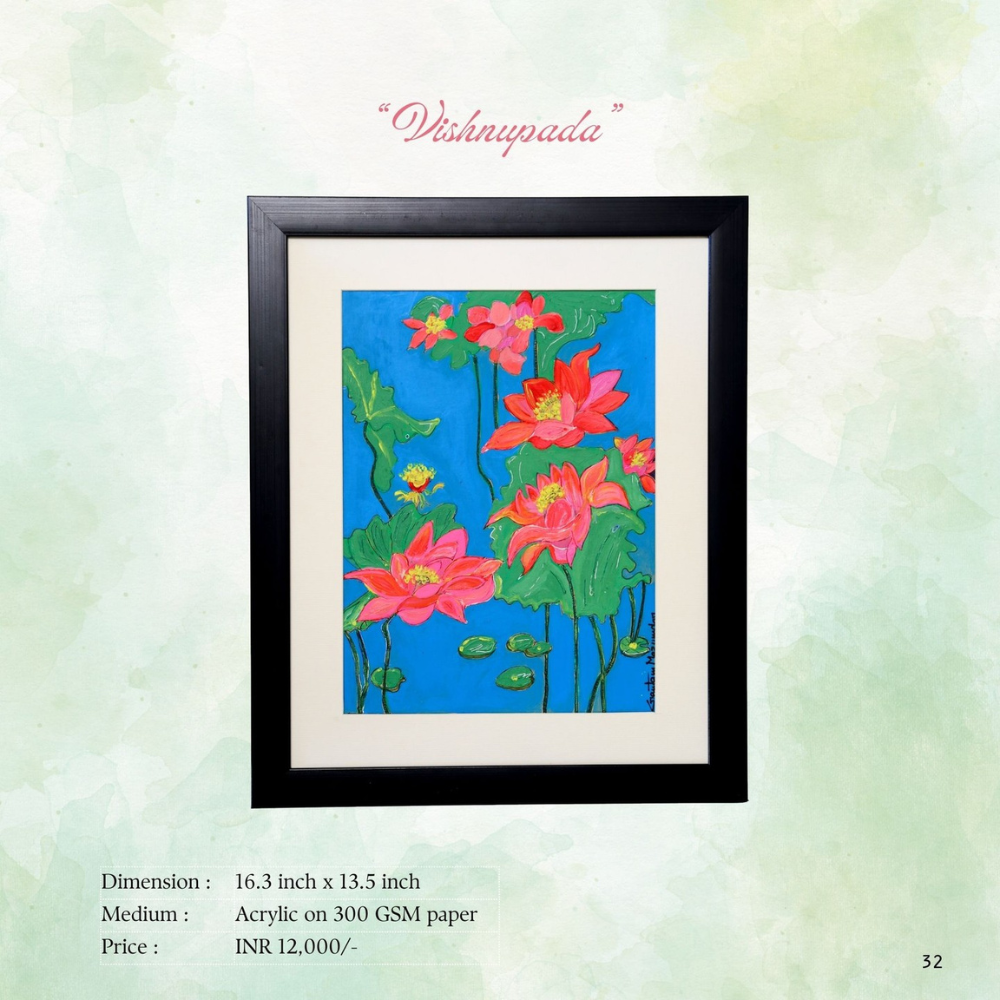 Vishnupada” (विष्णुपद) is a mesmerizing acrylic portrait that captures the serene presence of the lotus in a tranquil pond. The painting draws inspiration from Hindu mythology: “Vishnu,” the preserver of the universe, and “pada,” meaning foot, symbolizing Vishnu’s lotus feet. Gautam Mazumdar’s acrylic technique brings vibrancy, depth, and tranquility to the composition, highlighting the spiritual symbolism of the lotus as a bridge between divinity and nature. This original hand-painted artwork exudes calm, devotion, and a harmonious aesthetic suitable for collectors of spiritual and nature-inspired art.